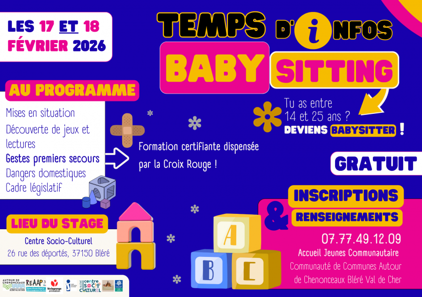 « Le Temps d'information Baby-Sitting ».- 17 et 18 février 2026, au Centre Socio-Culturel de Bléré.